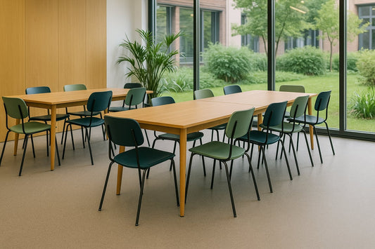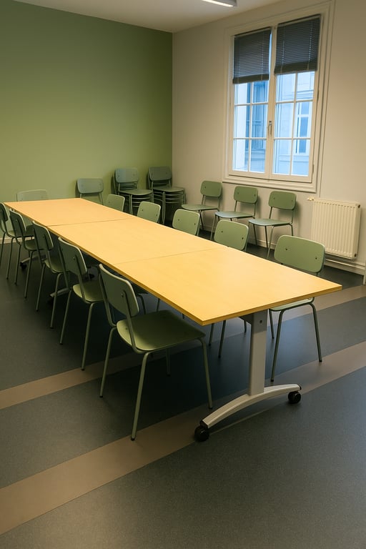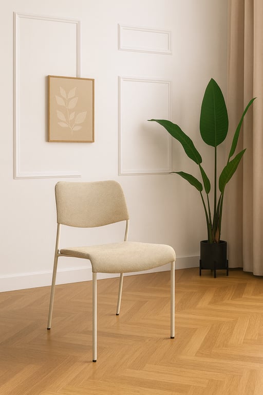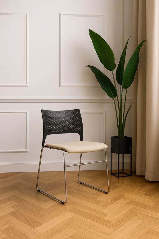 Cette chaise ne dispose pas de roulettes ni d'accoudoirs, ce qui met l'accent sur sa légèreté et sa facilité de rangement. Le piètement droit et la possibilité d'empiler ces chaises en font une solution pratique pour optimiser l'espace dans vos salles de réunion.