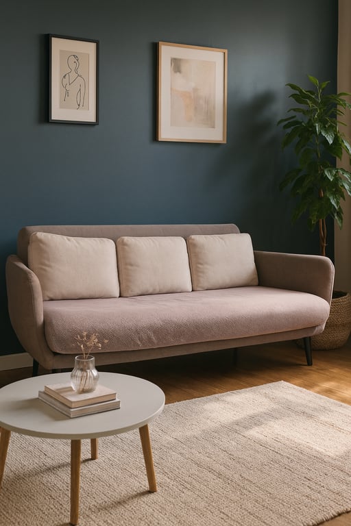 Chaise bicolore avec accoudoirs : dossier bleu, assise grise.
