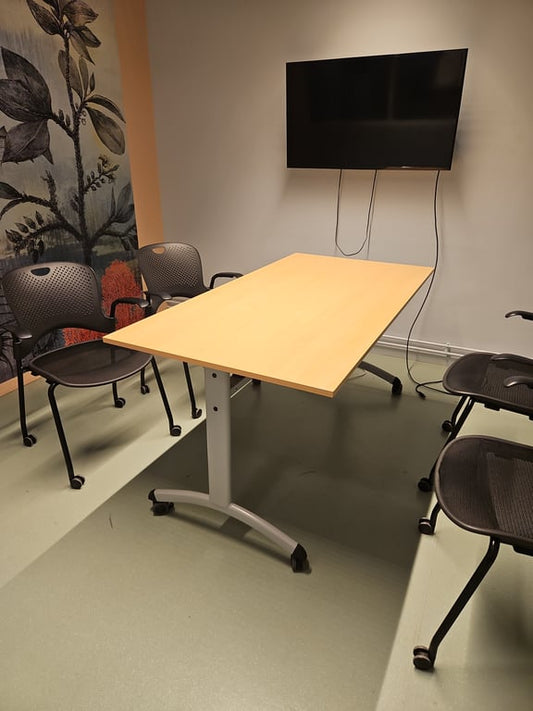Table de réunion en bois de dimensions 180x80x75. Sa couleur bois apporte une touche chaleureuse à l'ensemble de la pièce.