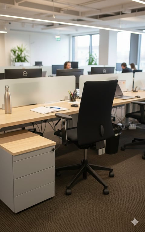 Ce bureau est doté de fonctionnalités pratiques telles que des accès "Top access", des goulottes et un espace entre les plateaux pour une gestion efficace du câblage. La présence de cloisonnettes multiples ajoute un niveau de confidentialité, avec une hauteur de 55 cm et une largeur de 160 cm pour chacune.