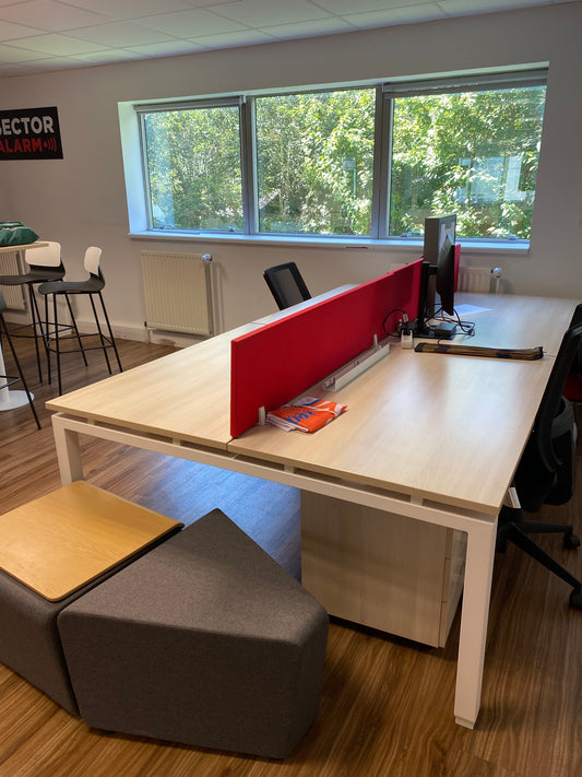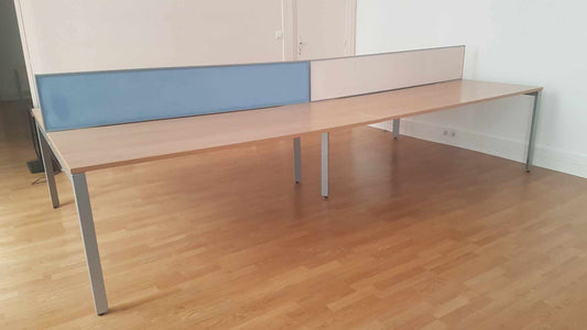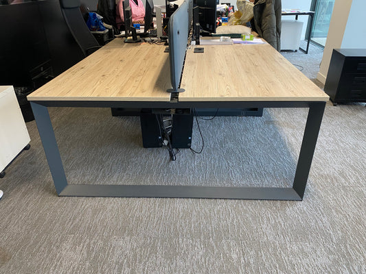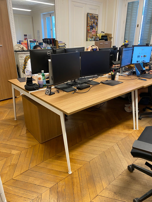 Bureau bench 2 postes avec goulotte centrale et ports électrique, éthernet et USB. Plateau bois et pieds noirs. Rayures sur les pieds.