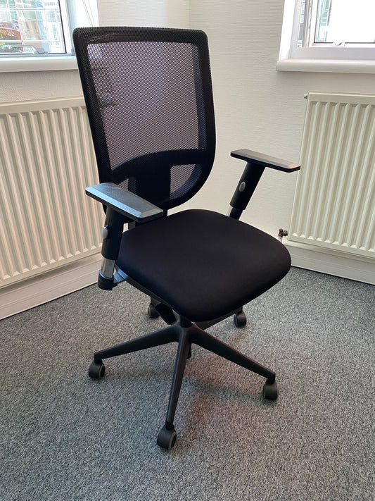 Le fauteuil de bureau Sokoa Tertio S est conçu pour offrir un confort optimal avec ses accoudoirs réglables en hauteur. Il est revêtu de tissu noir de haute qualité.