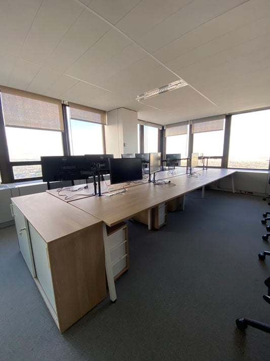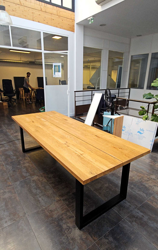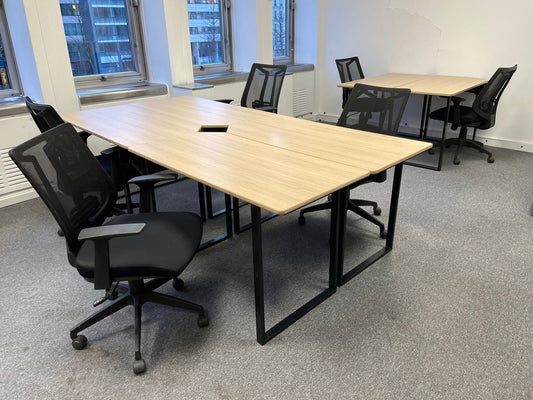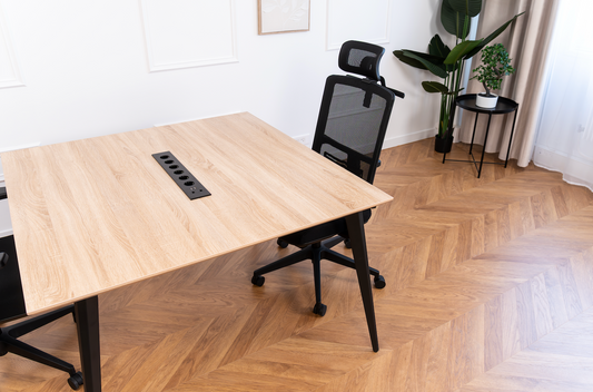 Ce bureau multiposte de la marque Orex est conçu pour accueillir deux postes de travail. Le plateau est en bois de couleur naturelle, apportant une touche élégante à votre espace. Les pieds en métal noir ajoutent une stabilité robuste à la structure. Il dispose également d'un système de passage de câbles électrique pour une organisation optimale.