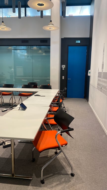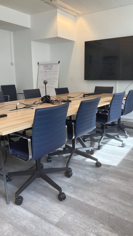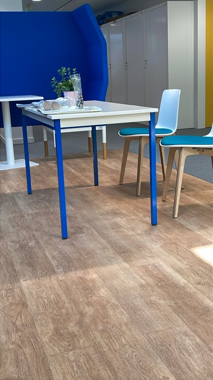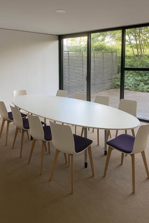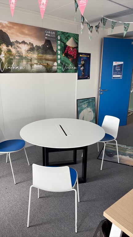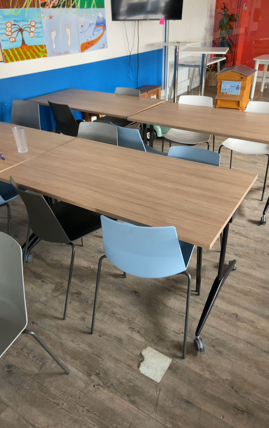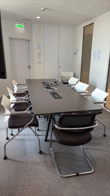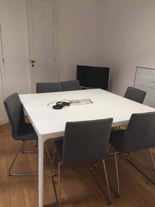 Table de réunion en bois de dimensions 180x80x75. Sa couleur bois apporte une touche chaleureuse à l'ensemble de la pièce.