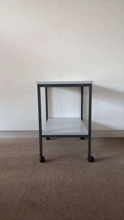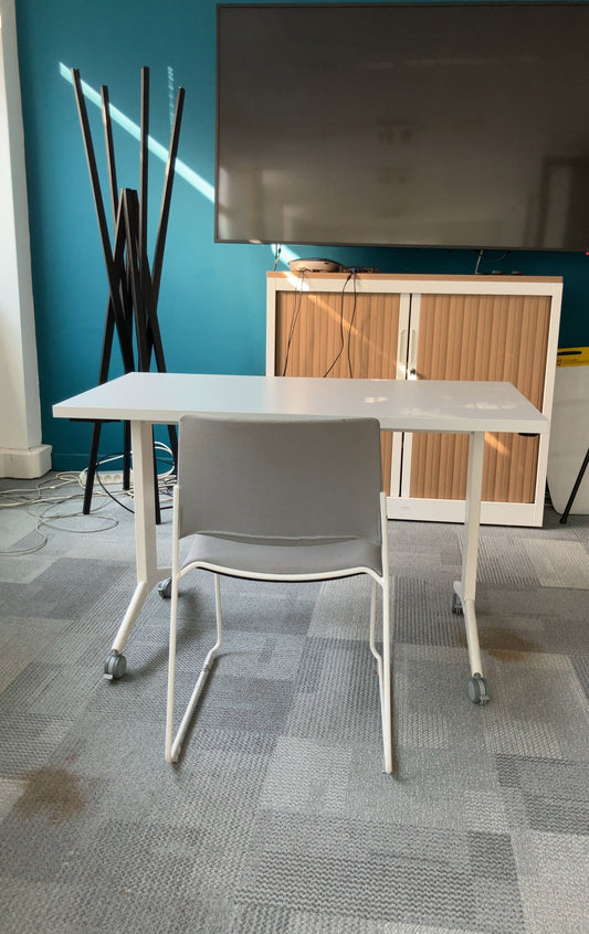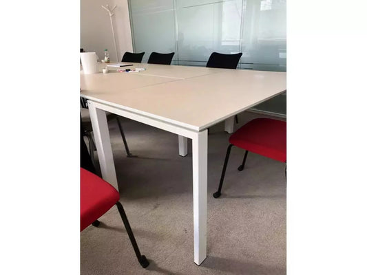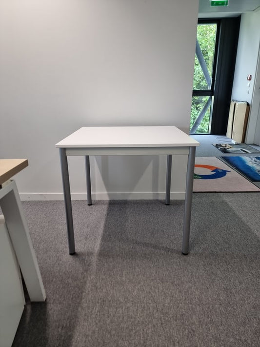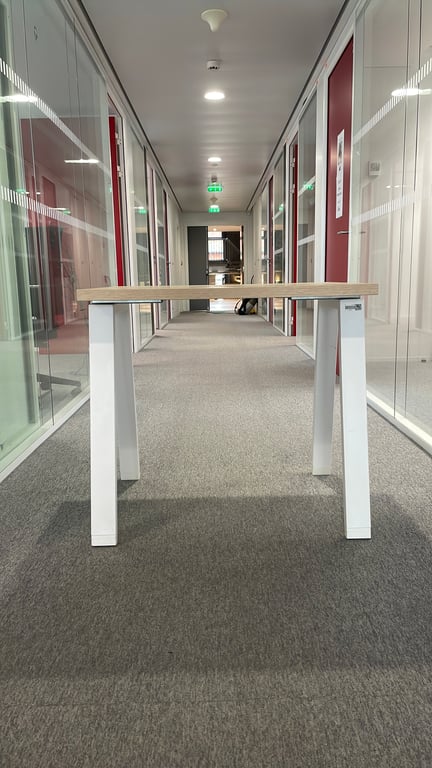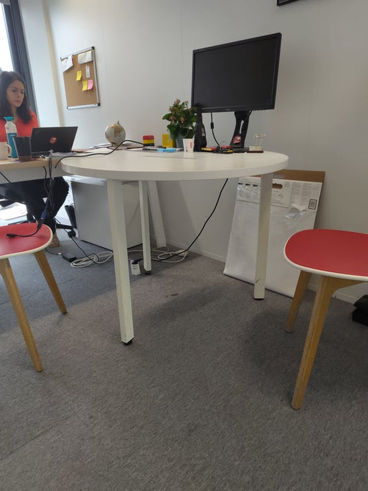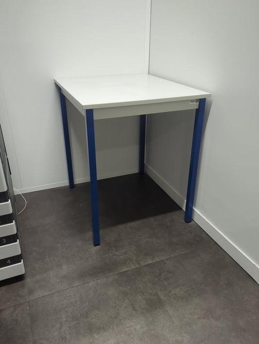 Le plateau est fabriqué en mélaminé, disponible en couleurs Ebb et blanc, assurant une esthétique moderne et s'intégrant facilement à tout espace de travail. Les pieds en métal revêtus de couleur blanche garantissent stabilité et robustesse.