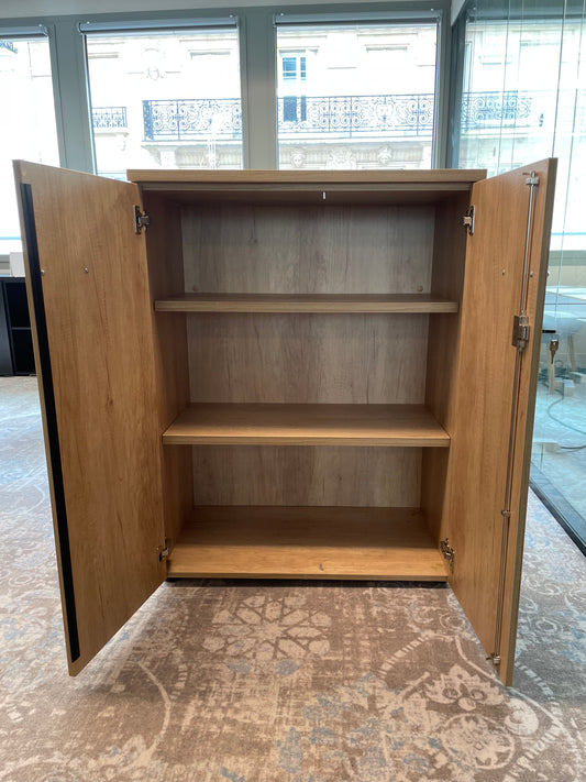 Armoire en bois avec poignées grises, deux étagères, présence des clés.