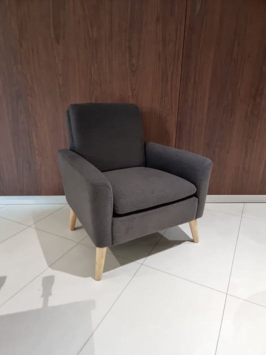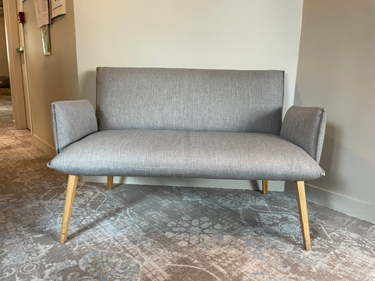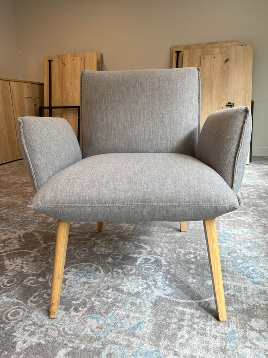 Fauteuil en tissu gris, pieds bois avec quelques traces.