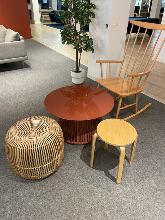 Table basse tout en rouge. Plateau en verre, socle en une partie avec des cordelettes en tissu et base en bois.