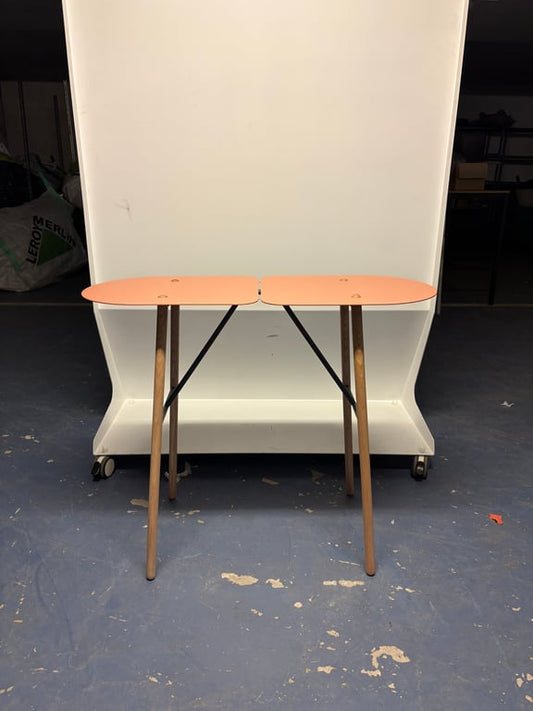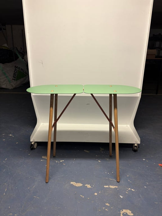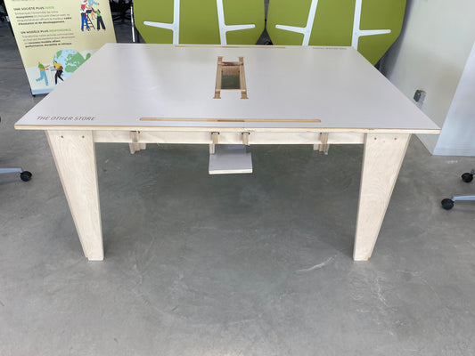 Bench deux personnes avec plateau en bois blanc et pieds en bois. Présence d'une goulotte et de deux petites structures surélevées amovibles.