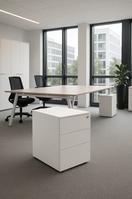 Ce caisson de rangement est équipé de roulettes pour faciliter son déplacement. Il offre une fermeture sécurisée par clé, bien que la présence des clés ne soit pas garantie. Conçu en mélaminé blanc, il s'intègre facilement dans tous les bureaux ou espaces de travail grâce à ses dimensions compactes (Hauteur: 60 cm, Largeur: 45 cm, Profondeur: 54 cm). Ce modèle est idéal pour optimiser le rangement tout en gardant un style épuré et moderne.