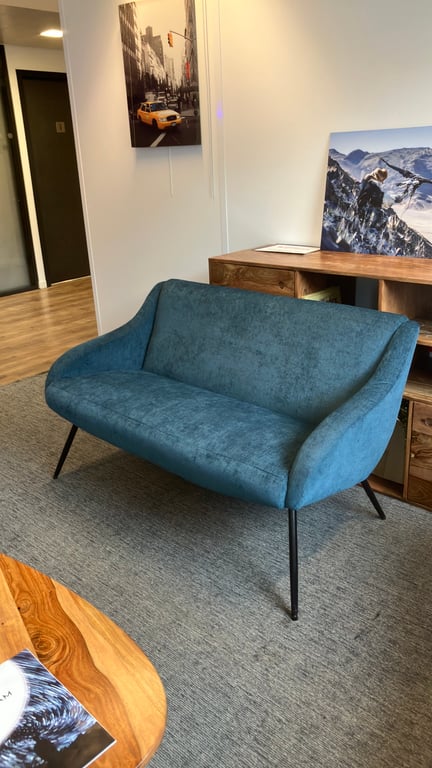 Fauteuil espace détente en velour rouge avec pieds crayons noir. Attention, bon état général mais pied tremblant sur une d'entre elles (voir photo).
