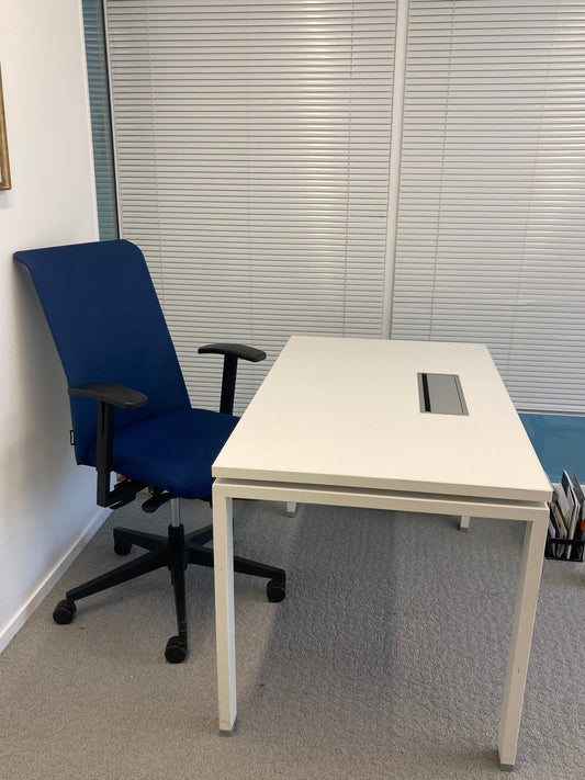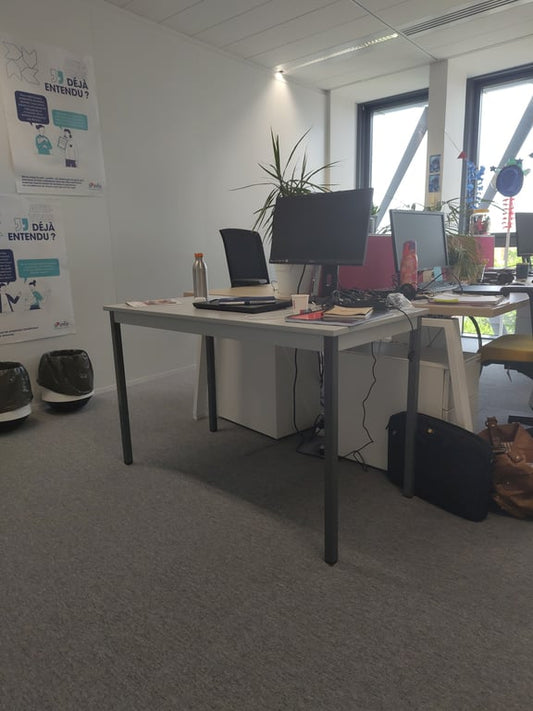 Ce bureau droit est conçu pour offrir une solution de travail pratique et efficace. Avec ses dimensions de 120 cm de largeur, 80 cm de profondeur et 70 cm de hauteur, il s'adapte parfaitement à des espaces de travail restreints. Il est équipé d'un plateau en bois de couleur blanche, soutenu par des pieds en métal également blancs, offrant une esthétique moderne et épurée. Doté d'un top access et d'une goulotte, ce bureau permet une gestion efficace des câbles. Remarque : Les top access ne se bloquent pas car une pièce est cassée.