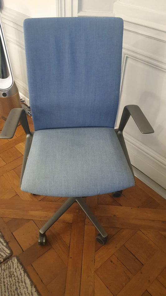 Fauteuil de bureau Haworth en tissu. Présence de roulettes. Fauteuil ergonomique réglable en hauteur. Accoudoirs rectangulaires.