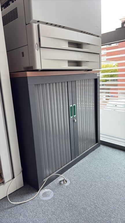 Cette armoire basse est idéale pour le rangement grâce à sa taille compacte avec une hauteur de 73 cm, une largeur de 80 cm et une profondeur de 43 cm. Elle dispose d'une porte coulissante et d'une porte à rideau, toutes deux avec un système de fermeture à clé pour plus de sécurité. Fabriquée en métal de couleur grise, elle offre une structure robuste tandis que ses portes en plastique apportent une touche de modernité. Elle est équipée d'une étagère et sa présence de clés n'est pas garantie. Elle ne possède pas de roulettes.