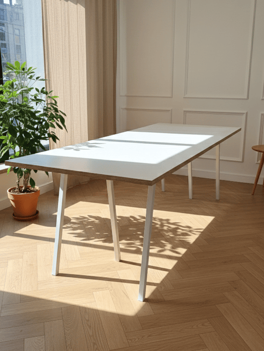 Plateau bois et pieds métal blanc.