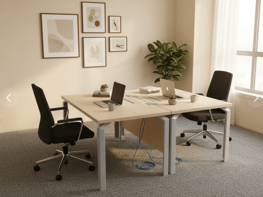 Ce bureau multiposte permet d’accueillir deux utilisateurs côte à côte, chacun disposant d’un espace de travail fonctionnel de 120 × 60 cm, conforme aux standards du mobilier de bureau. Sa configuration optimise l’espace tout en assurant confort et efficacité au quotidien.