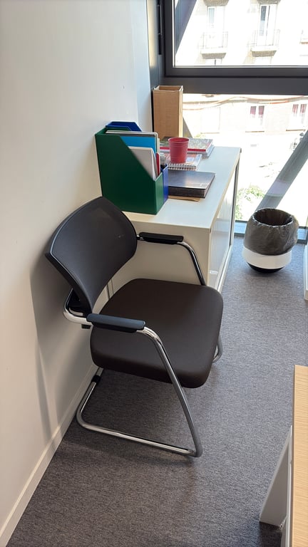 Découvrez cette chaise de réunion alliant confort et élégance. Elle est équipée d'accoudoirs en plastique noir pour un soutien optimal. Son dossier en résille noir offre une excellente aération et un style moderne. L'assise, en tissu de couleur Seance, repose sur un piètement luge en métal gris clair, garantissant stabilité et robustesse. De plus, elle est empilable, facilitant le rangement et le gain d'espace. Ses dimensions sont de 84 cm de hauteur, 49 cm de largeur, 48 cm de profondeur, avec une hauteur d'assise de 45 cm. Un choix idéal pour vos espaces de réunion.