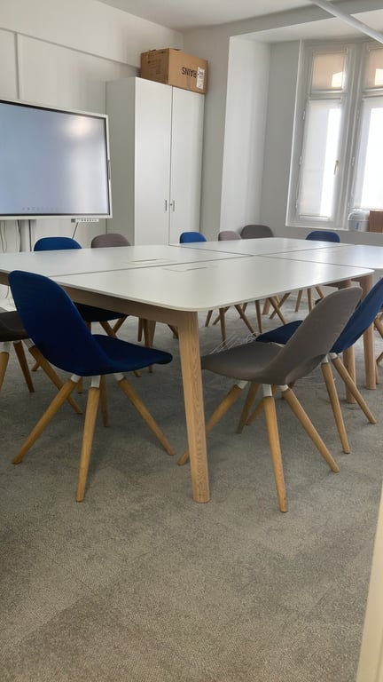 Découvrez notre bureau multiposte idéal pour optimiser votre espace de travail. Ce modèle propose deux postes de travail avec une largeur de 140 cm et une profondeur de 60 cm chacun. Sa hauteur totale est de 75 cm. Conçu avec soin, il est équipé d'un top access et d'une goulotte pour une gestion efficace des câbles. Le plateau en mélaminé blanc (#ffffff) et les pieds en bois couleur crème claire (#f6e4ca) ajoutent une touche élégante et moderne à votre bureau. Parfait pour créer un environnement de travail collaboratif.